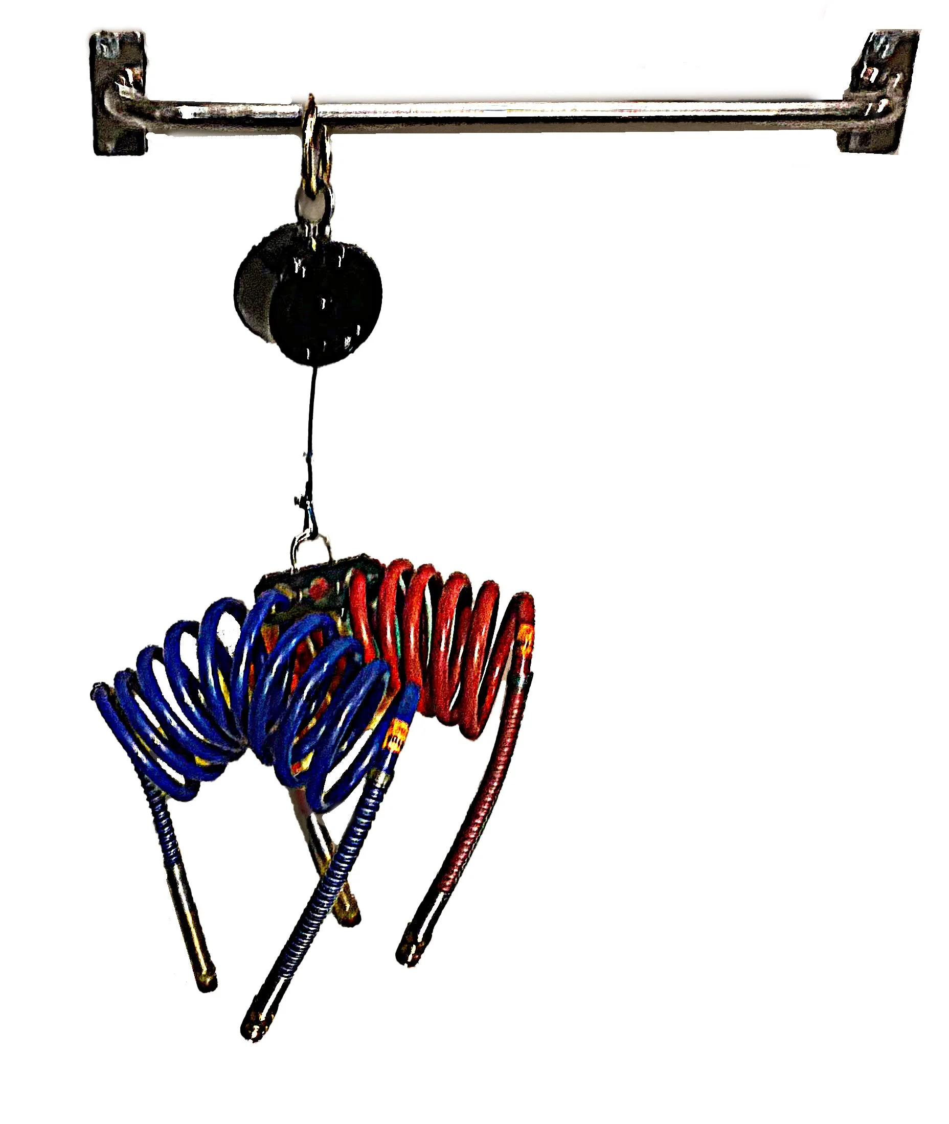The system uses a spool assembly with a small cable that extends and retracts smoothly as the truck moves. A tightly coiled spring provides the recoil mechanism, keeping hoses elevated whether the vehicle is driving straight, backing into a dock, or making sharp turns. This makes the Air Hose Retention System ideal for long-haul fleets, local delivery trucks, and any operation where trailer connection hoses are constantly in motion.