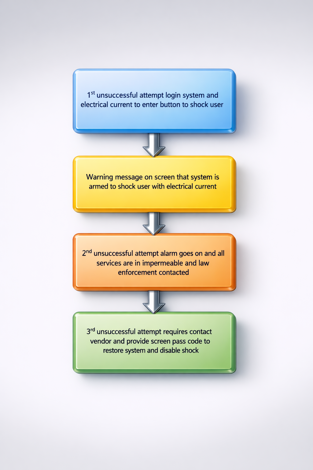 Mild Electric Shock: A brief, low‑voltage electric shock is delivered through the keyboard or user interface. This shock is intentionally calibrated to be safe but unmistakably corrective, serving as a physical deterrent to discourage continued intrusion attempts.