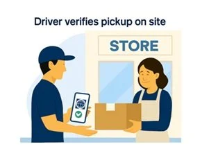 Driver arrives at retailer, verifies identity, and confirms pickup