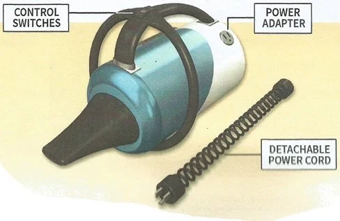 The Portable Power Blow Dryer Assembly is a high-performance, handheld, surface-drying device designed for use after cleaning, particularly when a towel-free, swirl-free finish is desired. Housed in a durable molded plastic case, the unit features a streamlined cylindrical body with a tapered exhaust port for directing airflow. The front-facing port narrows for concentrated drying power, while a mesh-covered rear intake ensures debris doesn’t enter the unit. A contoured handle, designed for ergonomic grip and directional control, wraps around the outer body, allowing users to easily angle airflow across various surfaces. Optional attachable spouts extend the reach of the airflow, making the device suitable for large vehicles like RVs and commercial trucks.