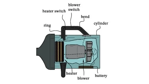Inside the case, the blower motor, heating element, and electrical assembly are integrated into a compact layout to maximize performance while maintaining portability. The blower motor, positioned near the rear intake, generates high-velocity airflow that is propelled through the internal chamber. Positioned ahead of the motor is the heating element, which warms the air before it exits the exhaust port, speeding up drying time and reducing streaks or spots. Users can control both the fan speed and heating function via integrated switches on the handle, allowing for adjustable airflow and temperature. A mesh rear intake screen protects the motor, and the outlet-facing exhaust port is shaped for directional efficiency.